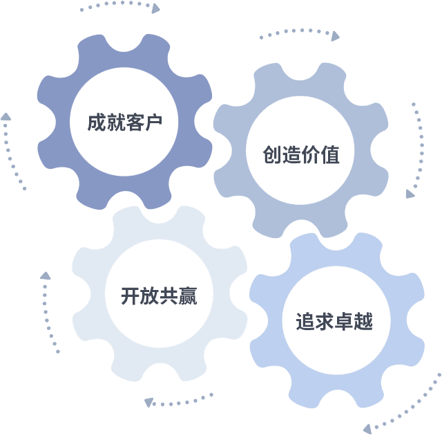 成就客户是一切决策的出发点,,,,创造价值是衡量所有工作的标准,,,追求卓越是我们做事做人的态度,,,开放共赢是我们的格局也是最终的结果。。价值观的齿轮环环相扣,,,推动着组织里的每个人不断向前。。