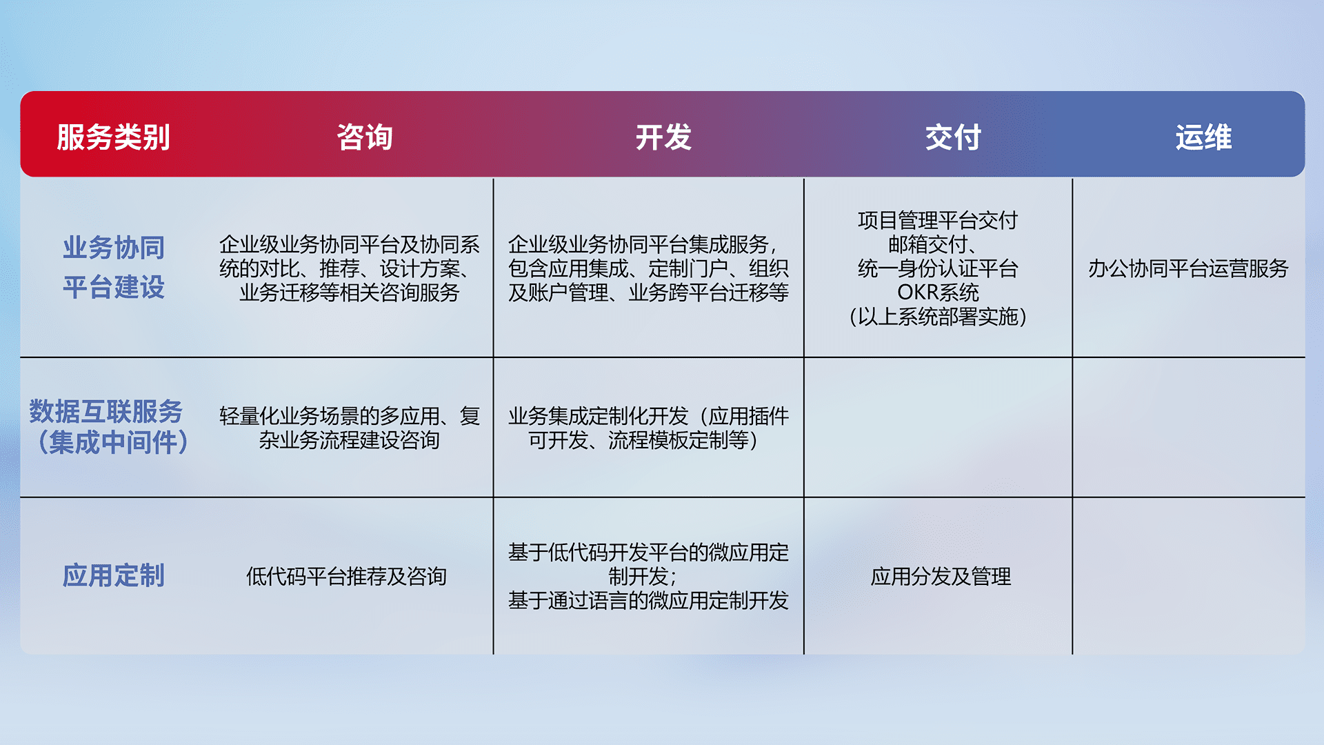 针对钉钉、、、、企微、、、、IDaas等平台级产品提供产品的规划、、方案、、、交付、、、、定制化开发等服务,,实现如统一协同办公、、、智能客户服务、、、混合会议管理、、、、智能数据查询、、、、等业务场景,,,,实现数字化转型。。